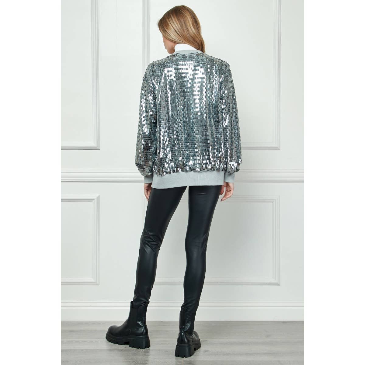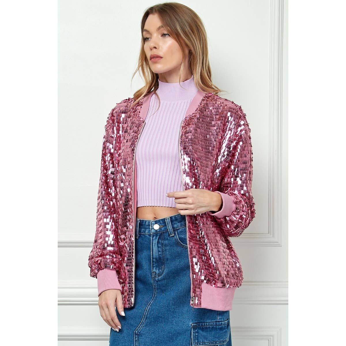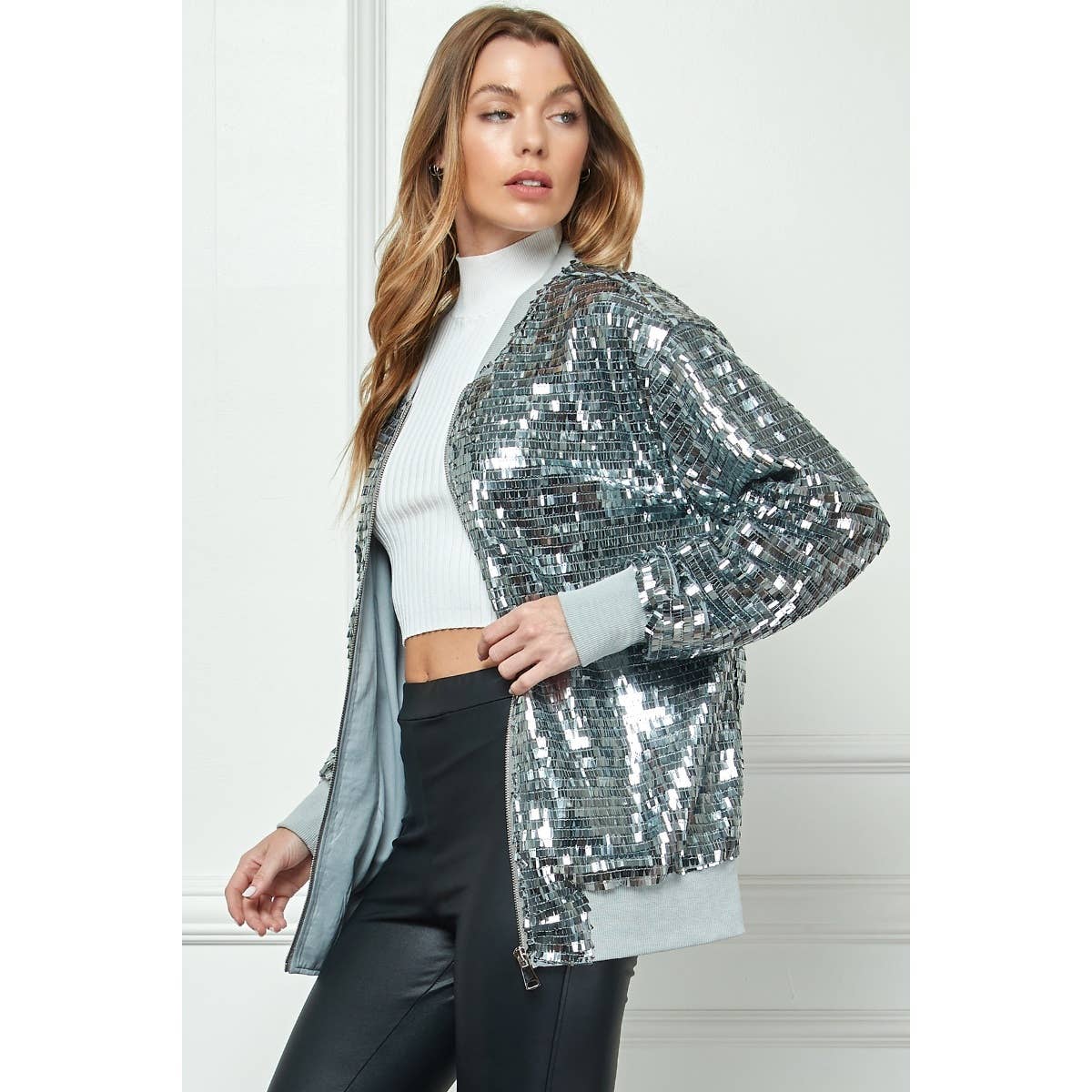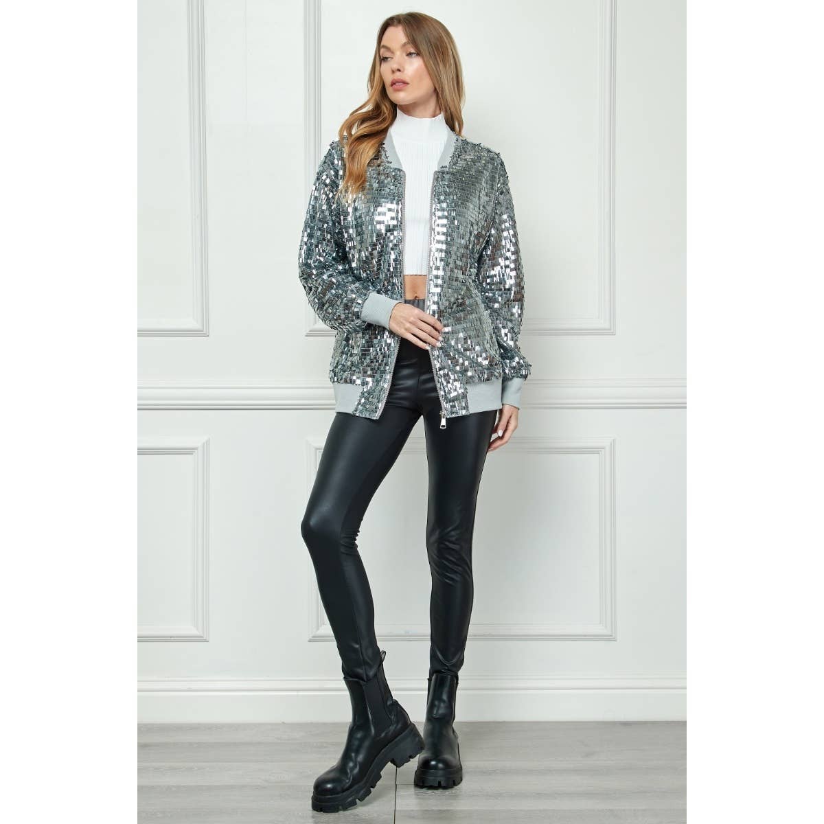All over sequins -Fully lined -Solid contrast -Relaxed fit -Zip up Zip up and step into a world of glitz and glamour! The Vegas Sequin Bomber Jacket is fully lined with all over sequins and solid contrast detail, making it the perfect statement piece for your next daring adventure. Its relaxed fit allows for easy movement, ensuring you're always ready for whatever excitement comes your way. Take a risk and turn heads with this bold and stunning jacket! Make a statement and stand out from the crowd with the Vegas Sequin Bomber Jacket. Fully lined with all over sequins and solid contrast detail, this jacket is the perfect way to add a touch of glitz and glamour to your wardrobe. With its relaxed fit, you'll have the mobility to take on any adventure with confidence and style. Elevate your fashion game and make a lasting impression with this bold and stunning piece!