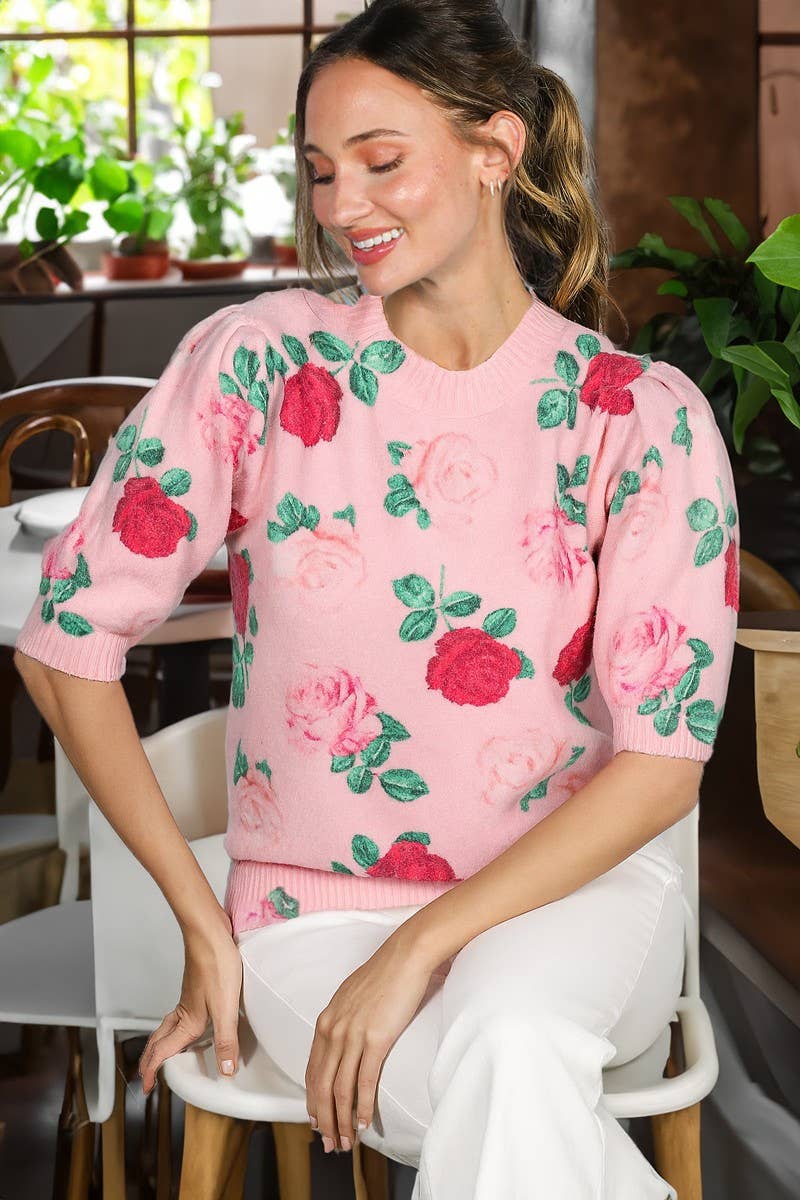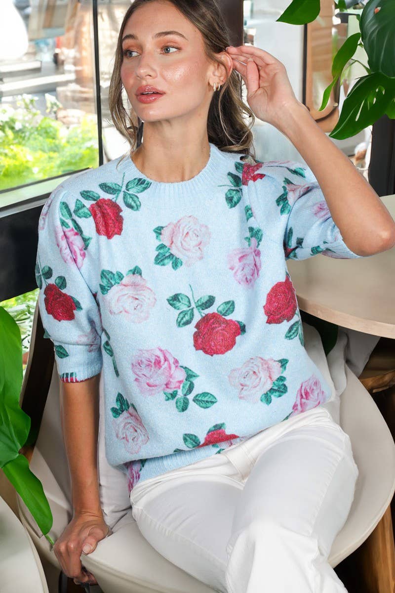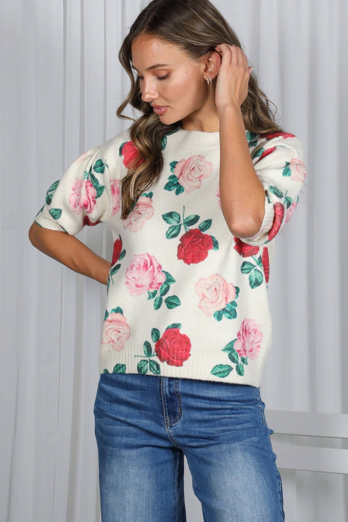 Introducing the 1 English Rose Sweater—your new go-to piece for effortless charm! This cozy knit features an all-over English roses floral print that brings romantic flair to any outfit. The ribbed crew neck and casual drop shoulders create a relaxed silhouette, while short puff sleeves with ribbed hems add a playful touch of personality. Crafted from skin-friendly knitted material, this sweater feels as good as it looks—soft fabric that gently wraps around you like a warm hug. Whether you're heading to brunch, the office, a night out, or just lounging at home, this versatile piece transitions seamlessly from day to night, keeping you comfortable and stylish every step of the way. Perfect for date nights, casual hangouts, vacations, or any moment that calls for a little extra coziness. The comfortable fit flatters beautifully—our model (5'8", 32-27-37) wears a Small. Slip it on and discover why this sweater is about to become your favorite layering essential!