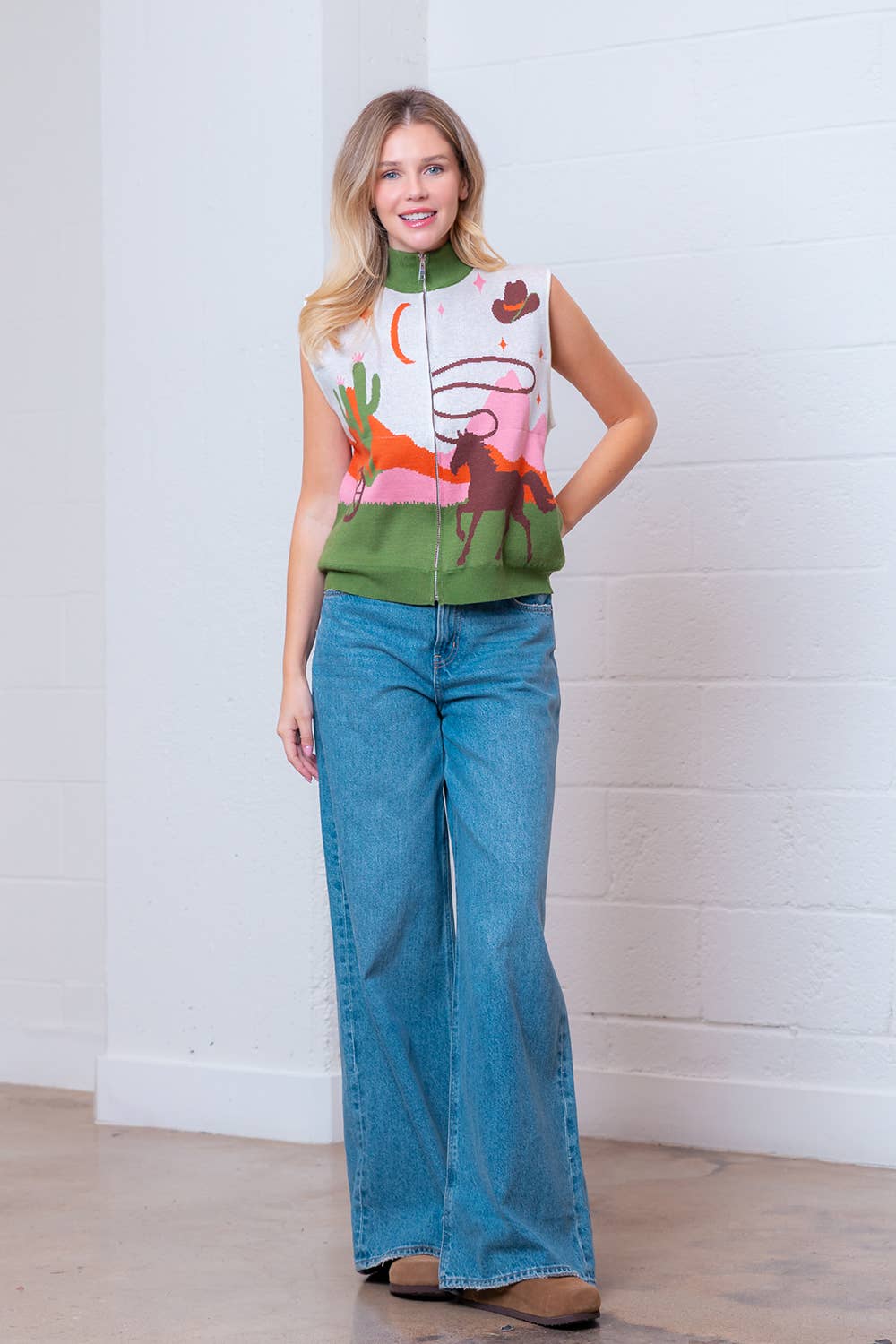 Sleeveless high neck western motive sweater vest -Texture: soft -Color: Camel -Pattern Type: western detail -Details: long sleeve, front zipper, high neck, sleeveless, western print -Neckline: high neck -Sleeve Length: sleeveless This one-of-a-kind vest is all about versatility and style! With a high neck, sleeveless design, and soft texture, you'll stay warm and cozy while looking effortlessly cool. The front zipper and western print add playful detail, making this vest a must-have for any fashion-forward cowboy or cowgirl. Plus, it comes in a trendy camel color that will go with any outfit. Get ready to turn heads with this unique sleeveless western motif sweater vest!